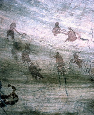 リズムに乗ってヒョコヒョコと踊っているように見えました。急峻な岩山の奥です。農耕をしていたことははっきりしています。狩猟も描かれています。ギリシャ、ローマは血なまぐさいですが、サハラは平和であったように見えます。