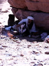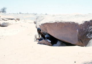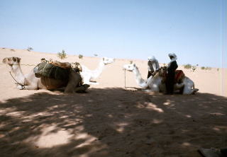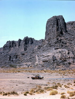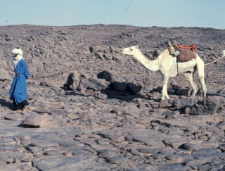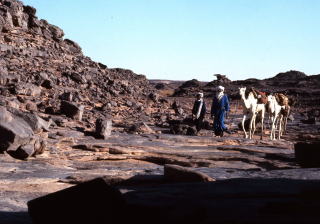壁画のある山岳地帯へは車では行けません。ロバやラクダで旅をしました。タッシリ・ナジェールへは、往復で1週間の旅です。急な岩山を歩きました。荷物はロバです。イリジーはラクダです。どちらも厳しい砂漠の岩山の中でした。