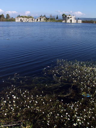 左は水没した建物の屋根、左下は水没した街路。中央はかつて船着き場だった場所で、大きな石柱に様々な像が刻まれている。右上は浴場跡、右下は劇場上部からの展望。