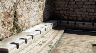左は共同トイレです。ギリシャ人は並んで腰掛け、議論や情報交換をしながら用を足したと言われます。便座の下は水が流れ水洗式です。 左上は売春宿の跡です。下は石柱が並ぶ街路で、古代都市の見事さを見せつけます。