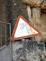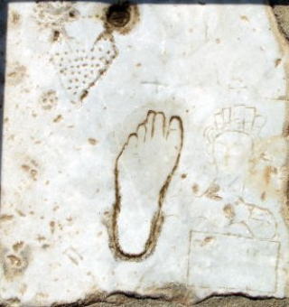 「女の顔とワイン壺が右下に見えるだろう。あれは売春宿を示しているんだ。足は重要だ。この足にその人の足を合わせてみて、それより小さいのは“子供”なので、通ってはいけないと言うことさ」