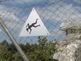 右は遺跡全景。上は転落危険、左は石垣崩壊注意の標識です。